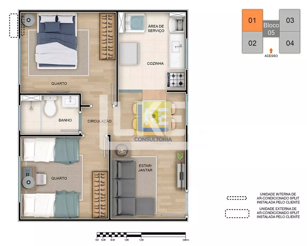 1 dormitório (PNE) Área total: 40,82m²