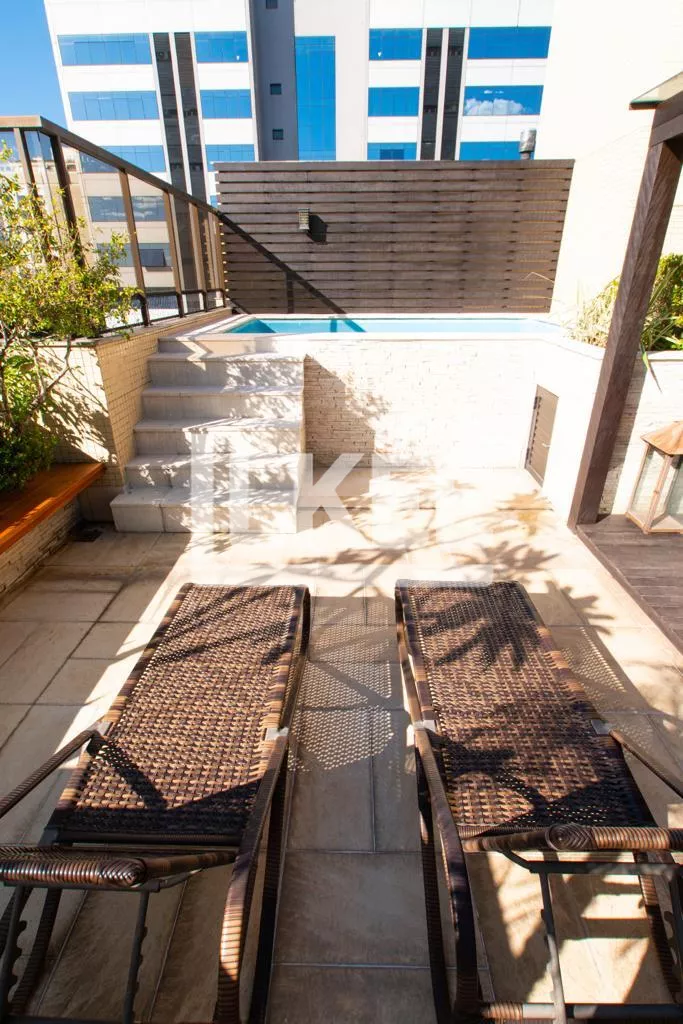 Ampla cobertura com 3 dormitórios (sendo 1 suíte), gabinete, lavabo, dormitório e banheiro de serviço. Seu living de estar de 80m², terraço com piscina e paisagismo, lareira e churrasqueira na cobertura e automação homesystem.