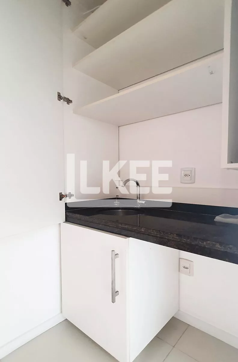 Sala comercial com móveis planejados, 2 lavabos, ar condicionado e 2 copas ocultas com tampo de granito e frigobar.