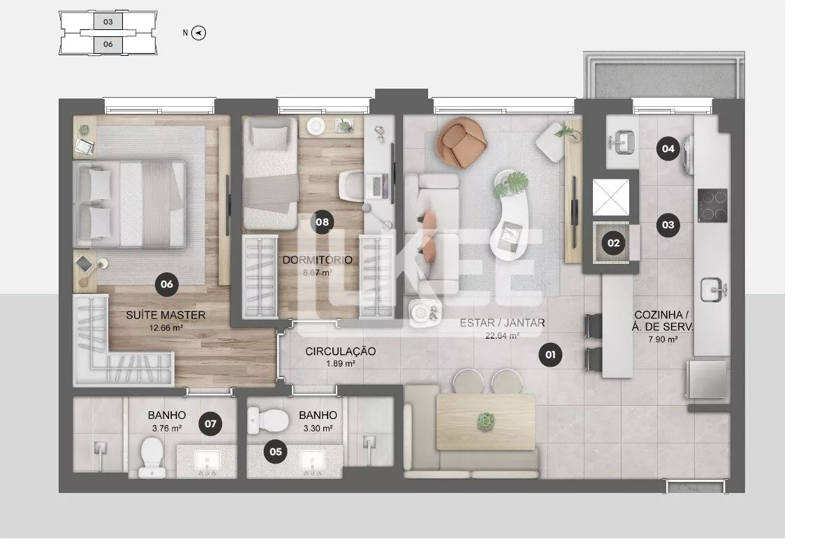 Apartamento living 2 ambientes, cozinha com churrasqueira em conceito aberto e área de serviço integrada. Área íntima com 2 quartos (sendo 1 suíte) e banheiro social. Sol da manhã na suíte máster e na sala de estar.