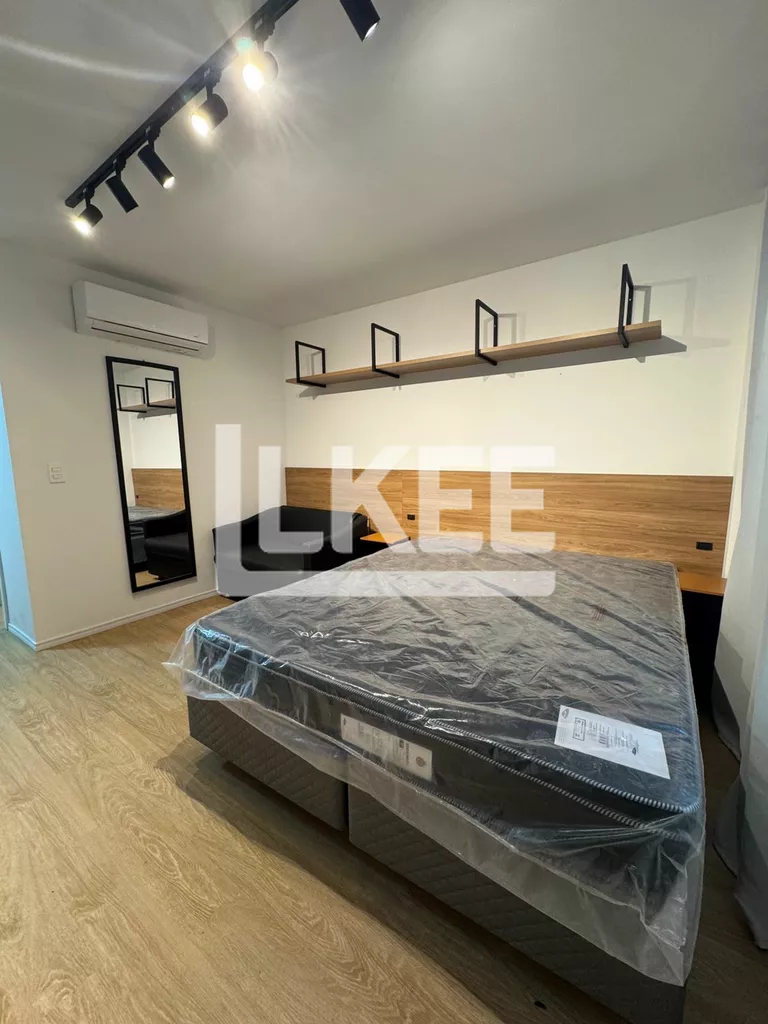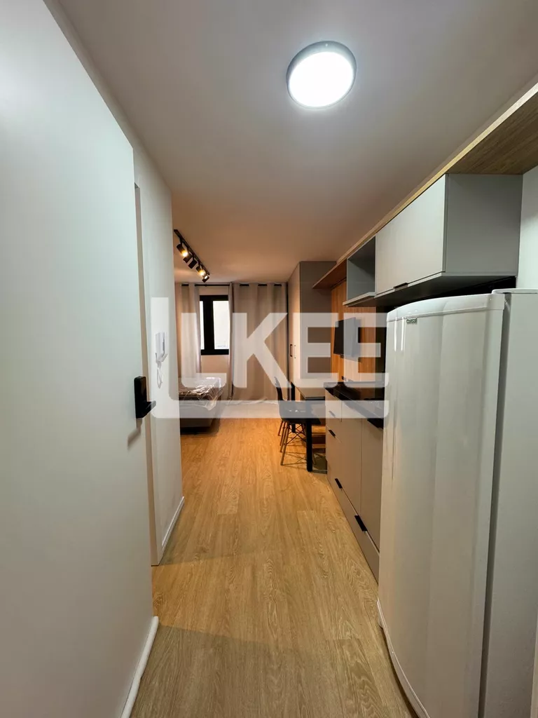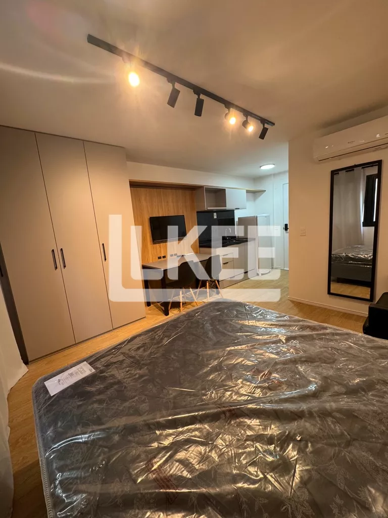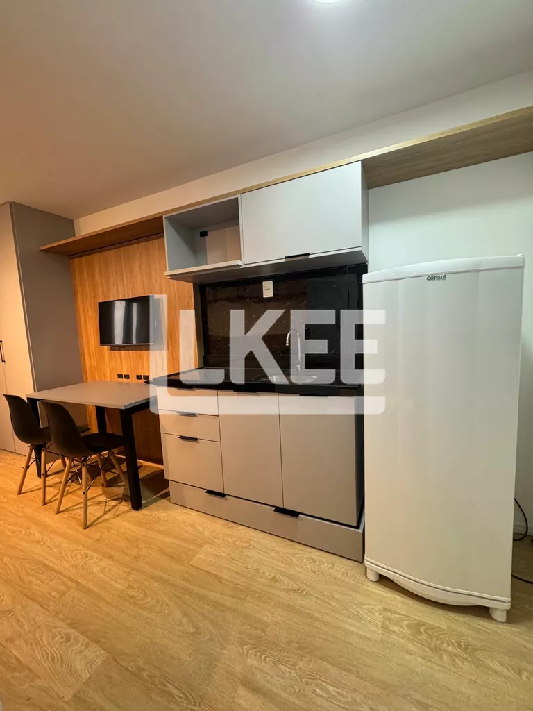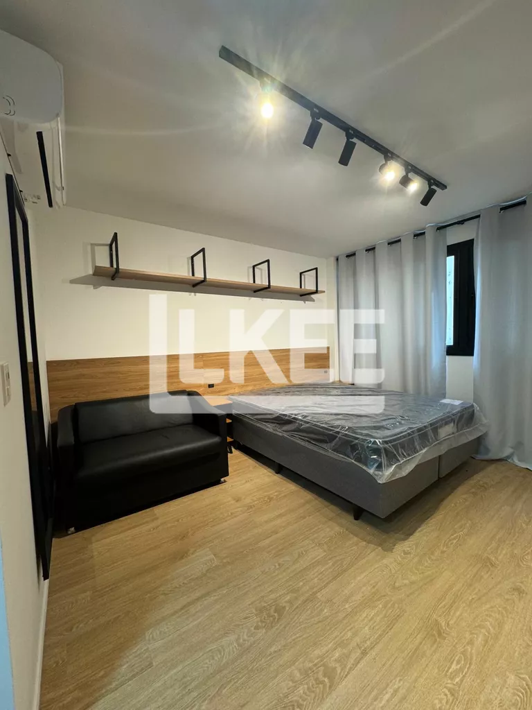 Studio mobiliado e equipado, conceito aberto, estar, quarto e cozinha. Banheiro. Ar condicionado instalado.