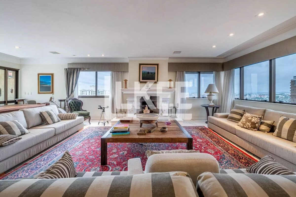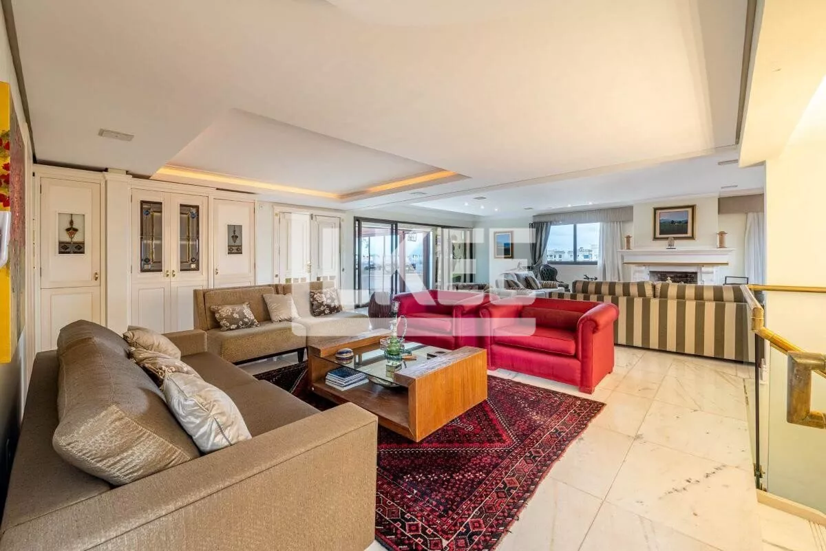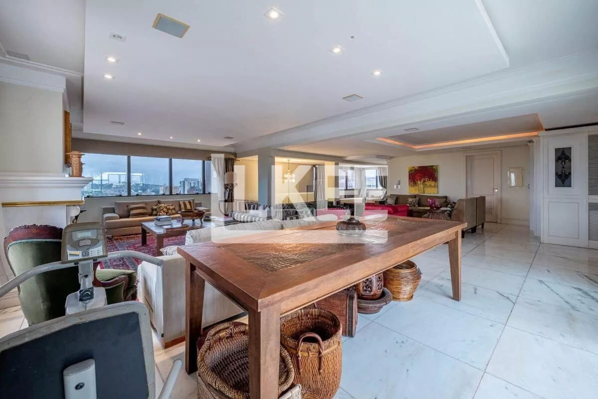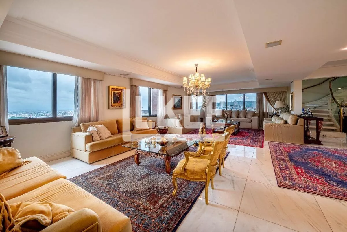 Hall, lavabo, área social que se destaca com living amplo de 2 ambientes com 120m² cada sala, piso social em mármore carrara branco até a escadaria, ar condicionado central, música em todos os ambientes. Cozinha, área de serviço, dependência de empregada. Ainda neste andar estão 3 suítes, transformadas em 2 (máster, com dormitório, gabinete, 2 closets, banheiro com hidromassagem numa área de 50m²). No segundo pavimento encontra-se a 3ª suíte. Área de terraço grande com teto e laterais de vidro. Todos os banheiros contam com ventilação natural. Possibilida de reverter a 5 quartos. O apartamento possui 2 pontos de energia por gerador.