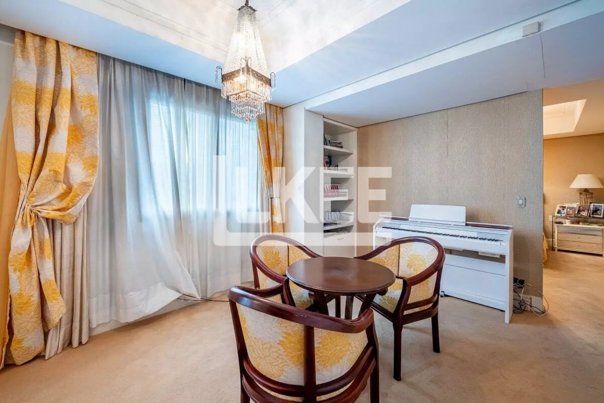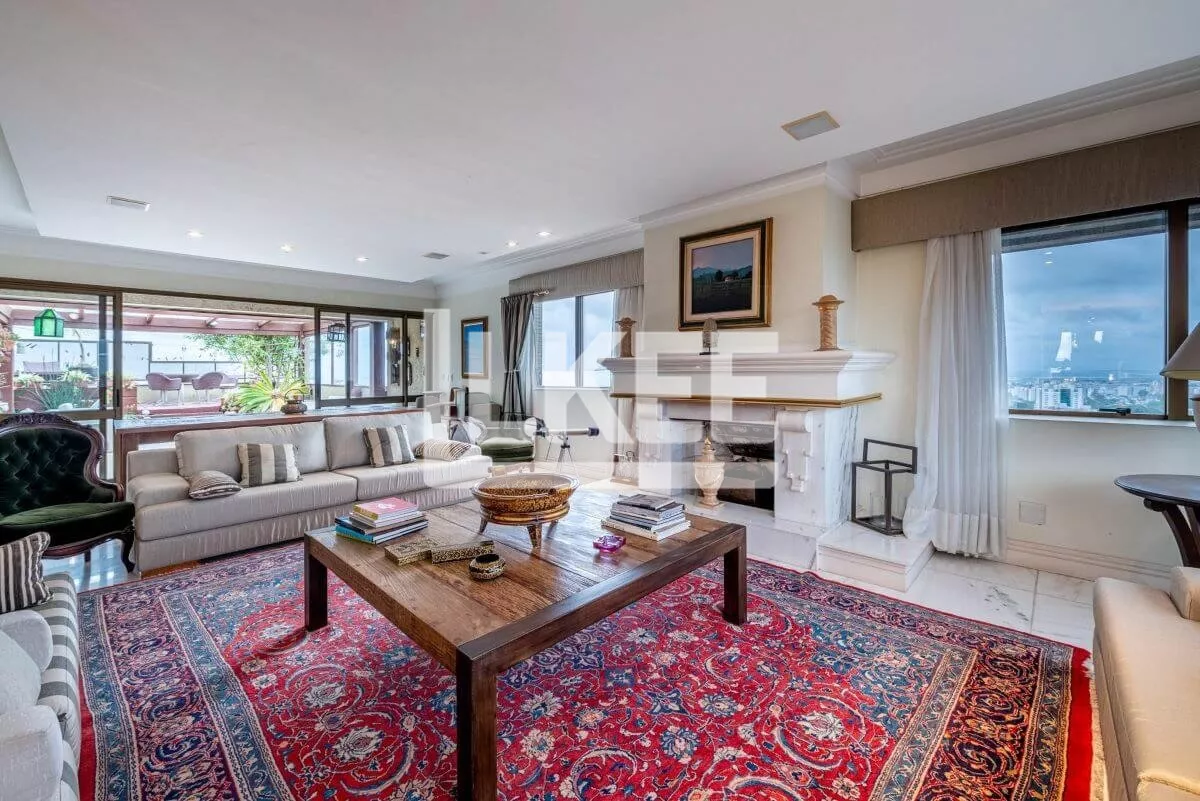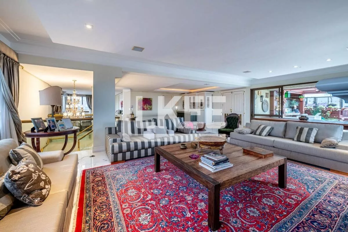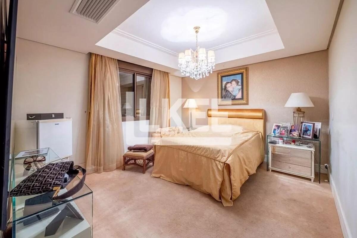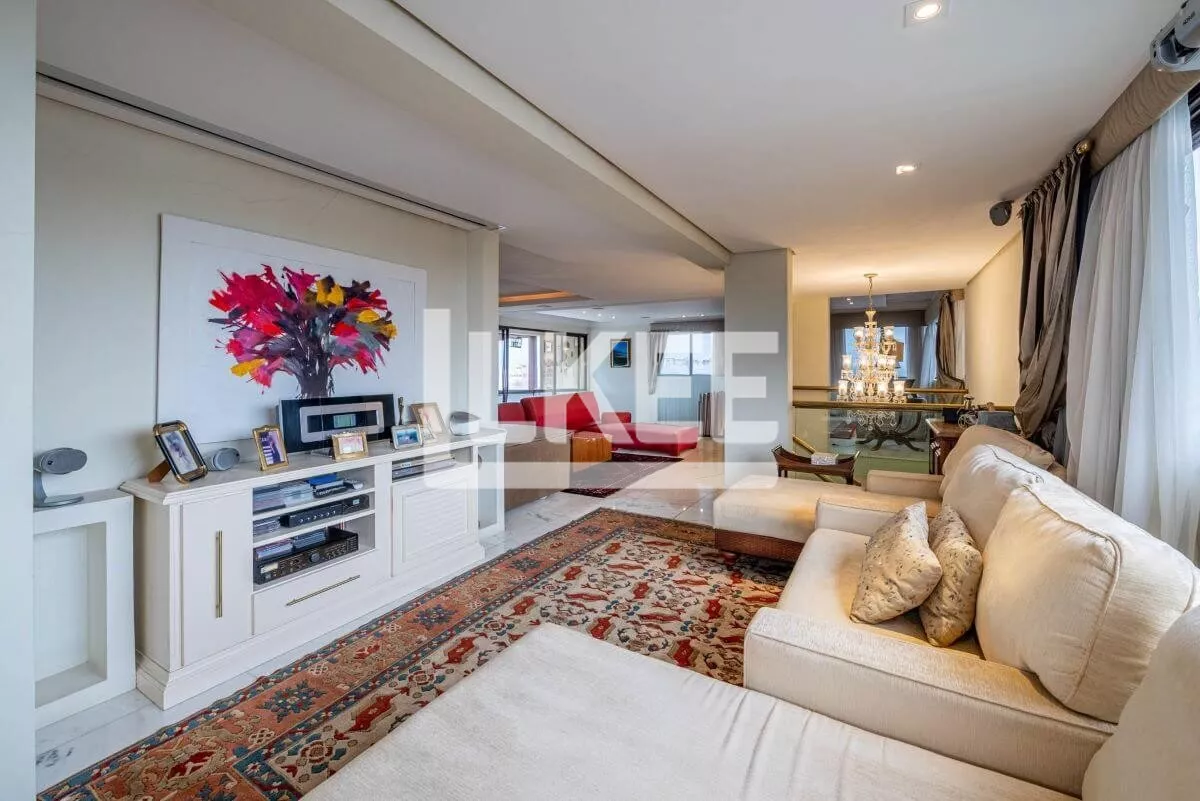 Hall, lavabo, área social que se destaca com living amplo de 2 ambientes com 120m² cada sala, piso social em mármore carrara branco até a escadaria, ar condicionado central, música em todos os ambientes. Cozinha, área de serviço, dependência de empregada. Ainda neste andar estão 3 suítes, transformadas em 2 (máster, com dormitório, gabinete, 2 closets, banheiro com hidromassagem numa área de 50m²). No segundo pavimento encontra-se a 3ª suíte. Área de terraço grande com teto e laterais de vidro. Todos os banheiros contam com ventilação natural. Possibilida de reverter a 5 quartos. O apartamento possui 2 pontos de energia por gerador.