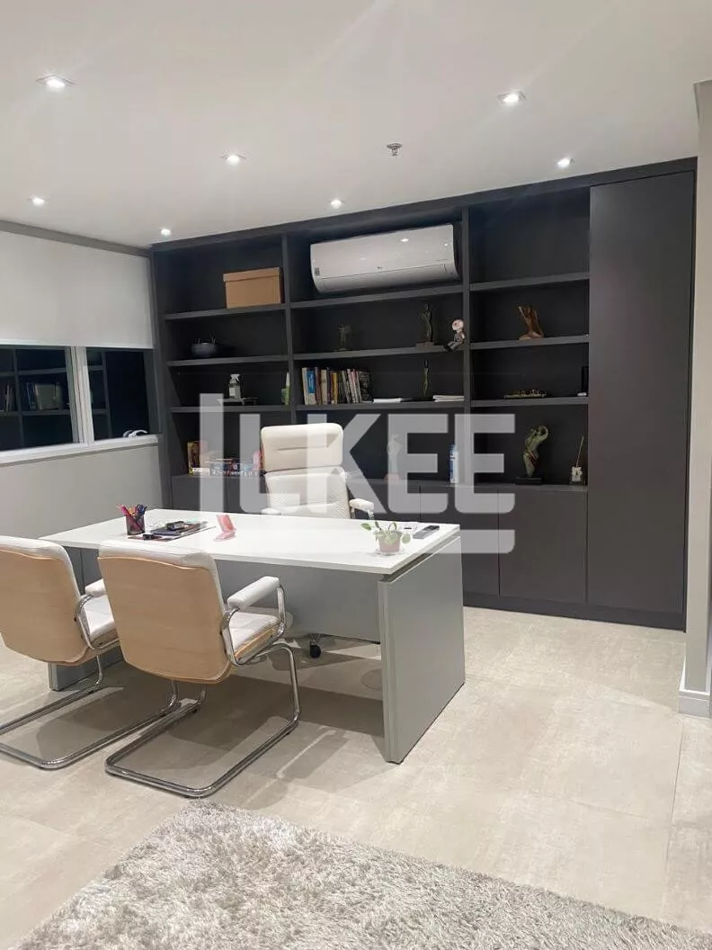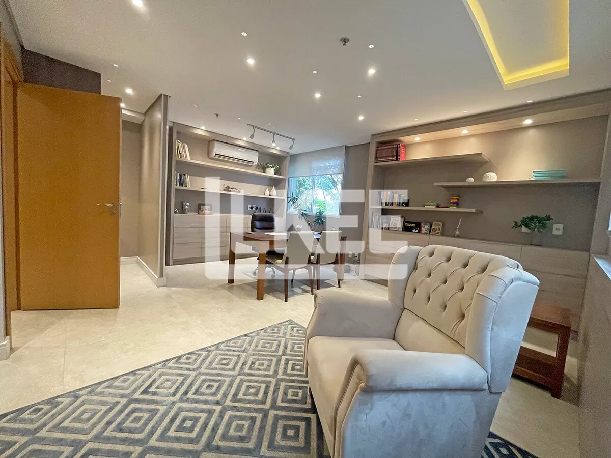 Sala comercial planejada são 2 salas que poderão ser unificadas. Composta por recepção acolhedora, copa equipada e lavabo de apoio. Sala ampla com 2 ambientes de atendimento com mesa de atendimento e cadeiras auxiliares, armário e ainda um espaço confortável e mais informal com sofás.