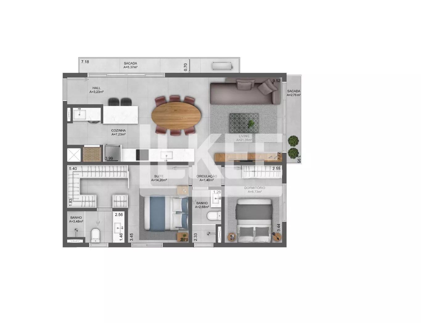 Neste apartamento os 81,09m² privativos estão distribuídos em entrada pela cozinha americana com churrasqueira, living de 2 ambientes sendo jantar e estar com sacada. 2 (dois) dormitórios (uma suíte com closet) e 1 banheiro social. Uma planta para quem valoriza amplo espaço íntimo e sacada. Lavanderia no condomínio.