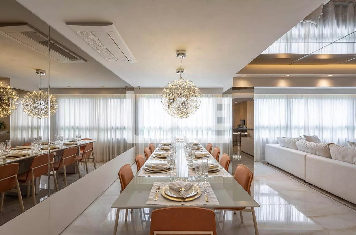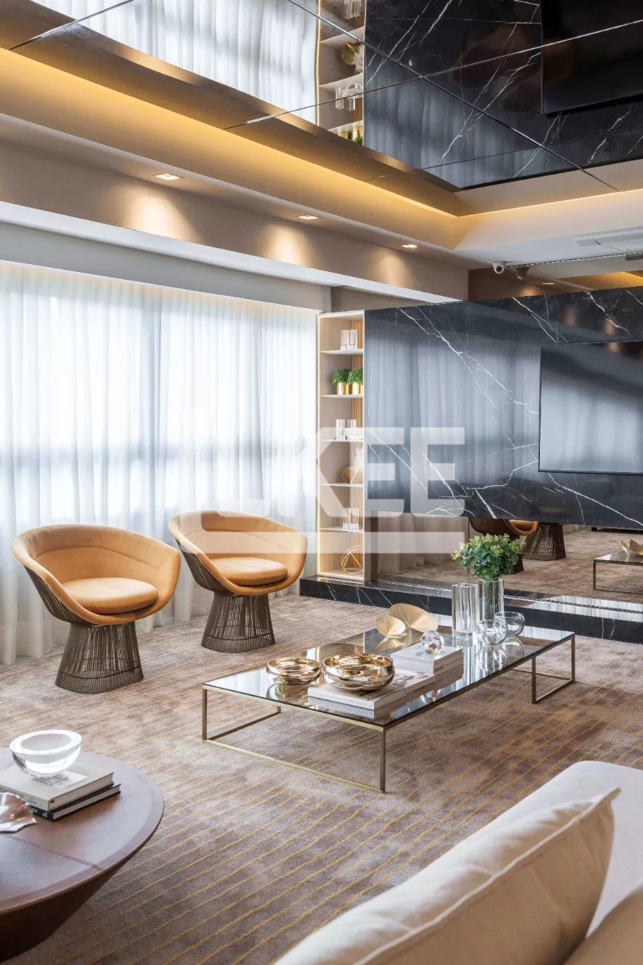 Apartamento, com 3 suítes uma delas com banheira no banheiro, sala de estar e jantar integrados, com lareira, churrasqueira, lavabo e banheiro social.