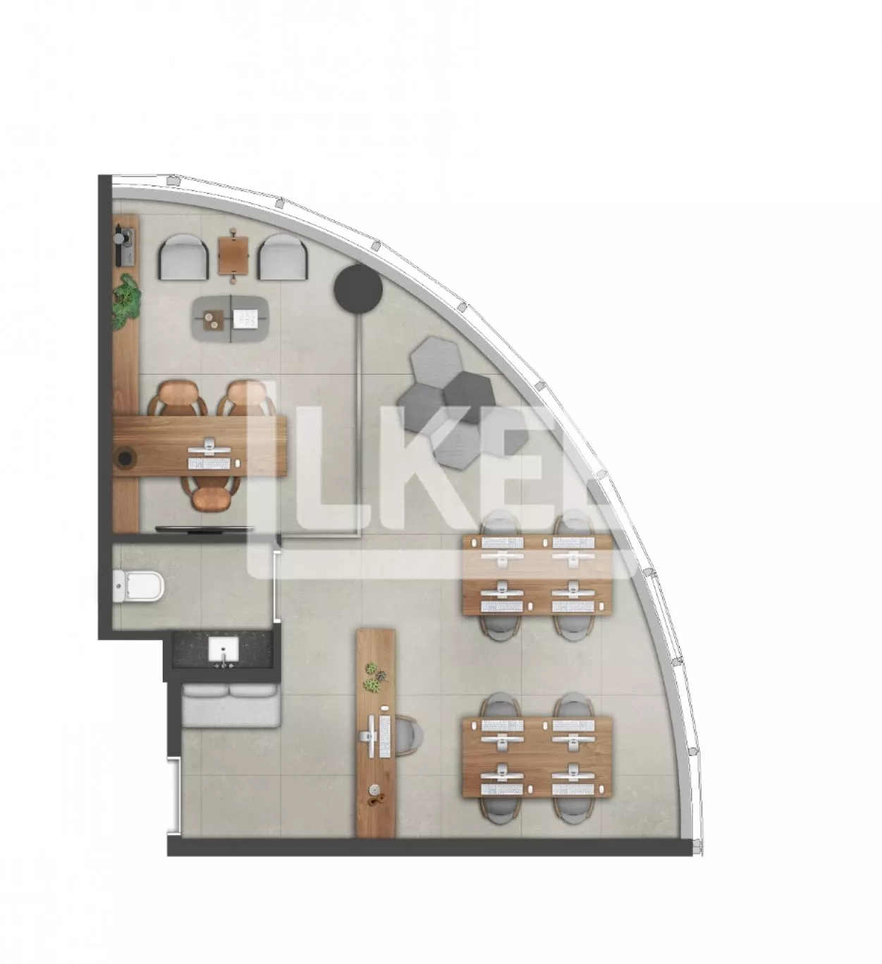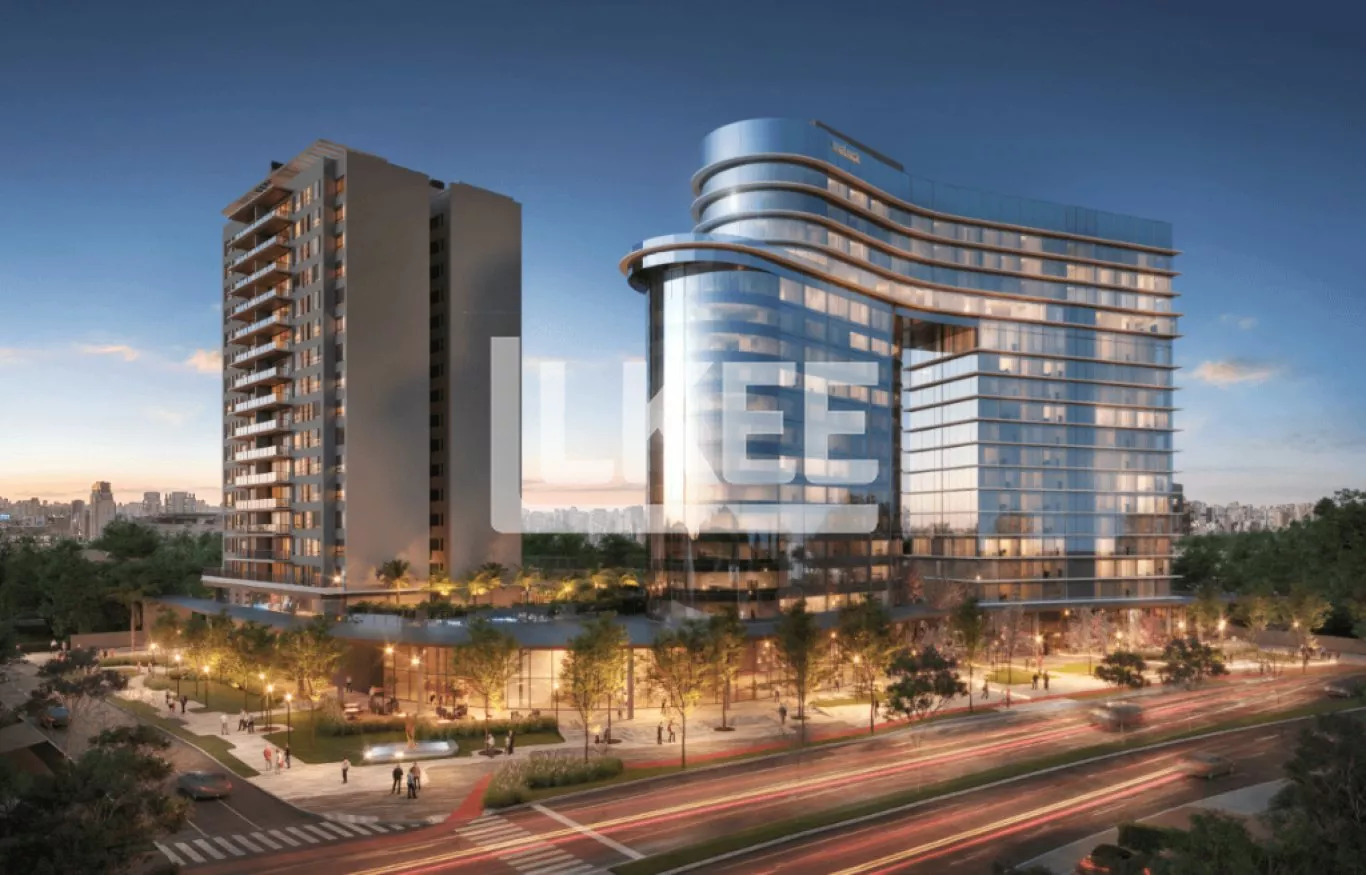 Fitness, coworking, área de convívio com restaurantes e estar, pub e cafeteria, piscina externa com vista 180°, espelhos d’agua com plantas e estar, copa, vestiários e banheiros equipados.